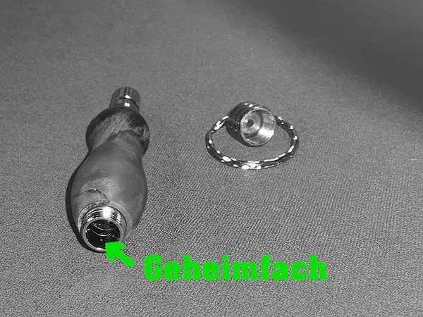 Ein Hohlraum (Durchm. ca. 8 mm und Länge ca. 6 cm) bietet Platz für Geldscheine oder Tabletten.
