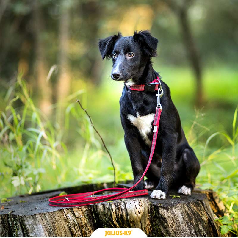 Am Leinenende ist ein zweiter kleinerer Karabiner angebracht. Die Leinenlänge kann sehr schnell mit dem kleineren Karabiner und 3 eingenähten Ringen verstellt werden.